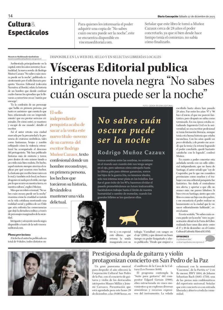 El diario regional, Diario Concepción, destaca la nueva novela publicada por el sello penquista Vísceras Editorial: Se trata de No sabes cuán oscura puede ser la noche, nuevo título del escritor Rodrigo Muñoz Cazaux, texto confesional donde un hombre reconstruye, en primera persona, los hechos que torcieron su historia, llevándolo…