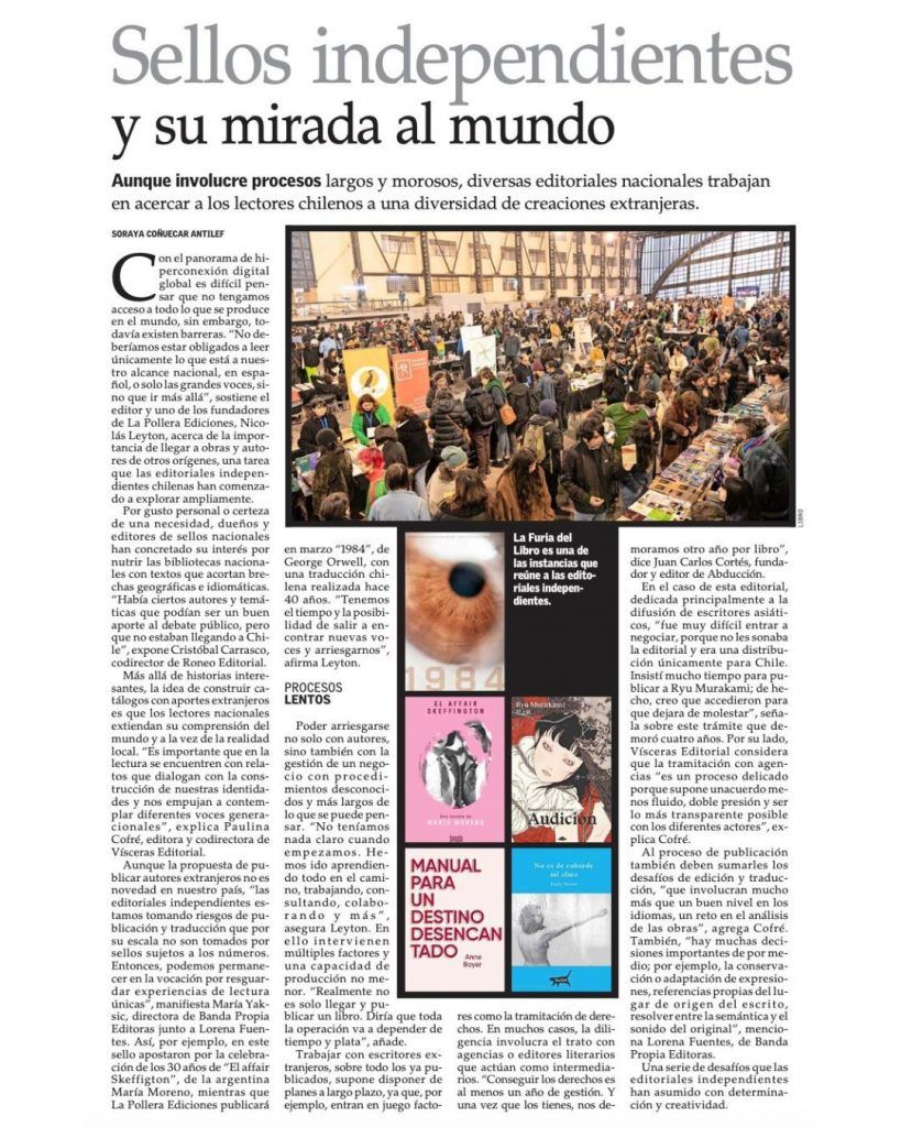 Este domingo 13 de abril de 2025, Vísceras Editorial fue destacada en el Diario El Sur en un reportaje dedicado a las editoriales independientes que impulsan la lectura en la región del Biobío y en Chile. En la entrevista, nuestras fundadoras, Paulina Cofré y María José Veloz, compartieron el camino recorrido desde 2018, año en que decidieron aplicar su formación en edición para crear un espacio que rescata voces diversas, a través de colecciones como Sin llave, Callejones, Narrativa Ghirlanda y Narrativa al borde. Contamos también sobre nuestro enfoque en la profesionalización de la edición, la importancia de formar equipos,…